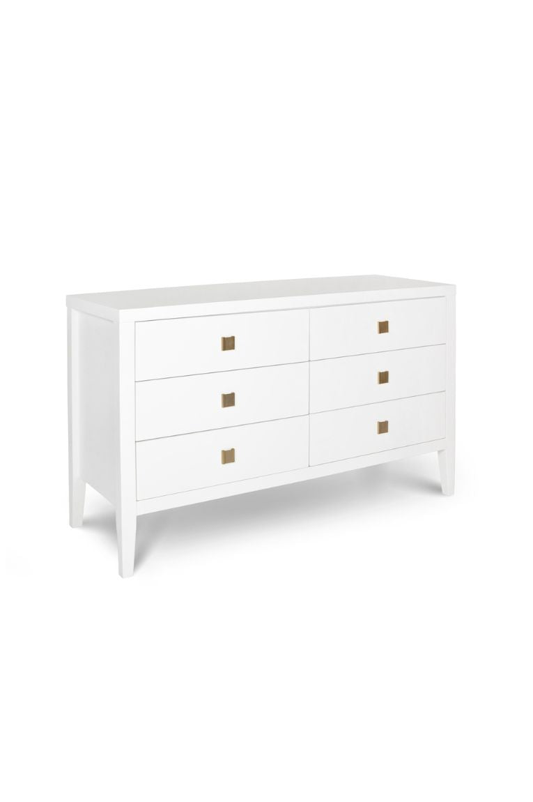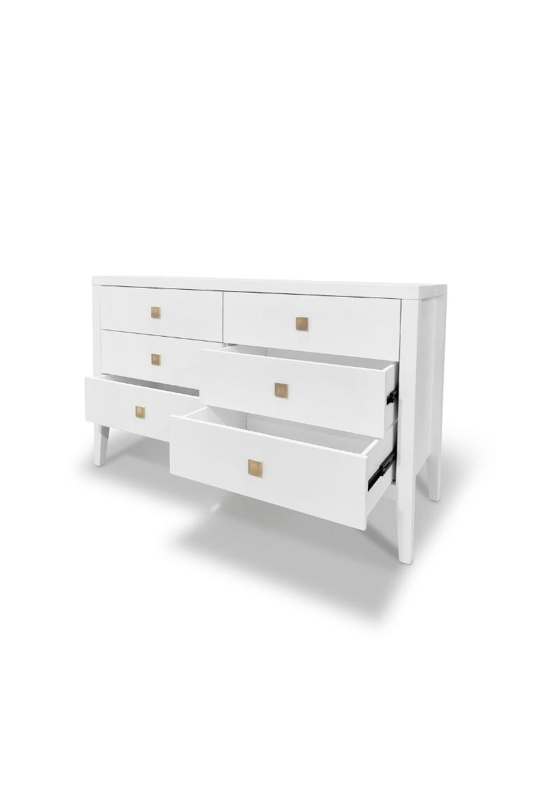 Crafted from durable rubberwood and beech veneers, this stunning dresser offers generous storage with its six spacious drawers. The brilliant finish and elegant brushed gold hardware pulls give just the right amount of refined sophistication.