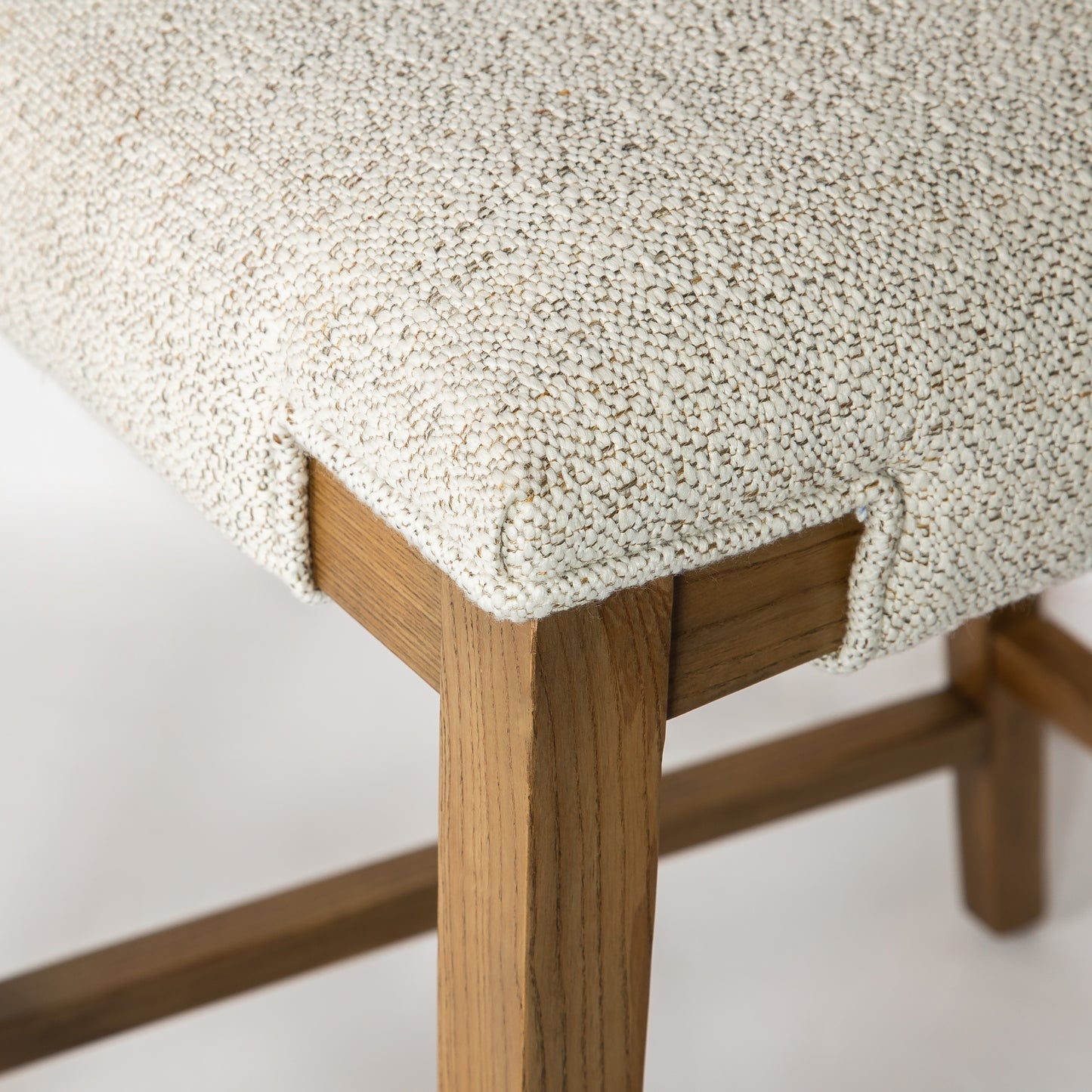 The Ezra Counter Stool is an updated nod to more traditional styling, upholstered in raw sugar polyester performance fabric and resilient foam. The solid rubberwood frame features a beautiful light oak finish. A true timeless classic counter stool.