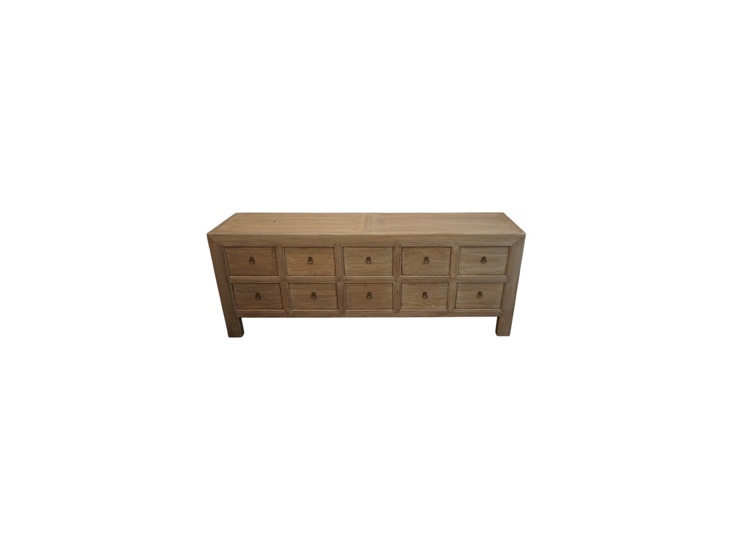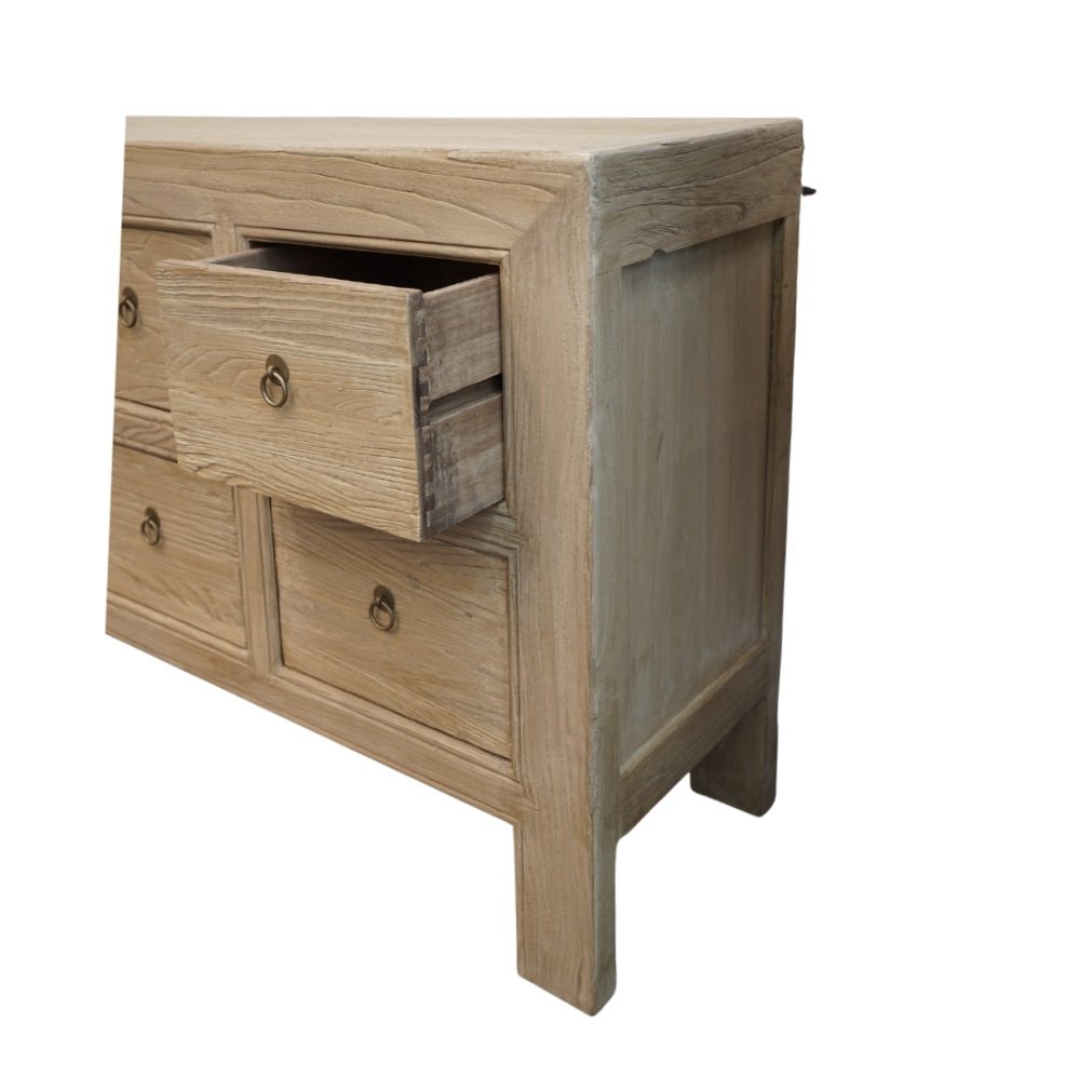 The design of the Reid Sideboard focuses on functionality, offering a series of drawers that provide ample storage space. These drawers are thoughtfully integrated into the sideboard's structure, allowing you to organize and store various items efficiently. The bronze ring hardware adds a touch of elegance and complements the rustic look of the wood, creating a harmonious visual contrast