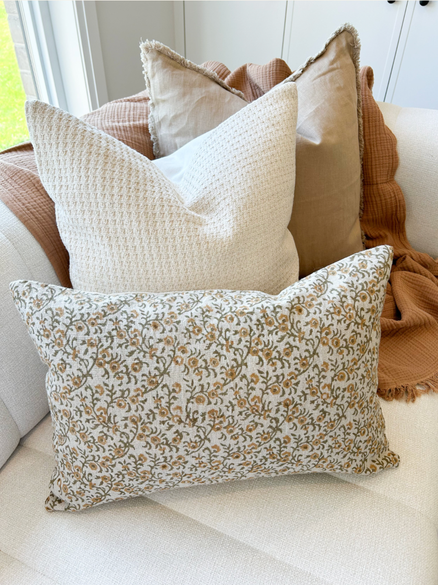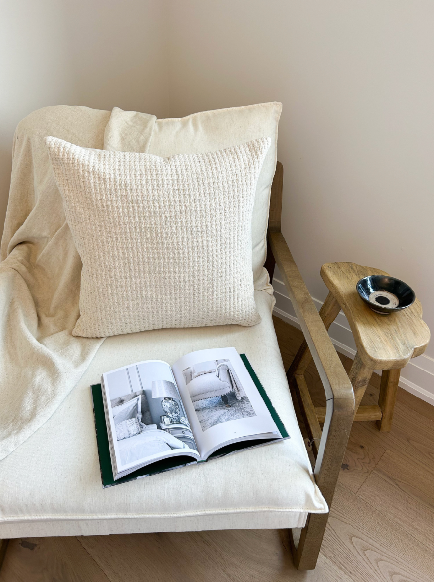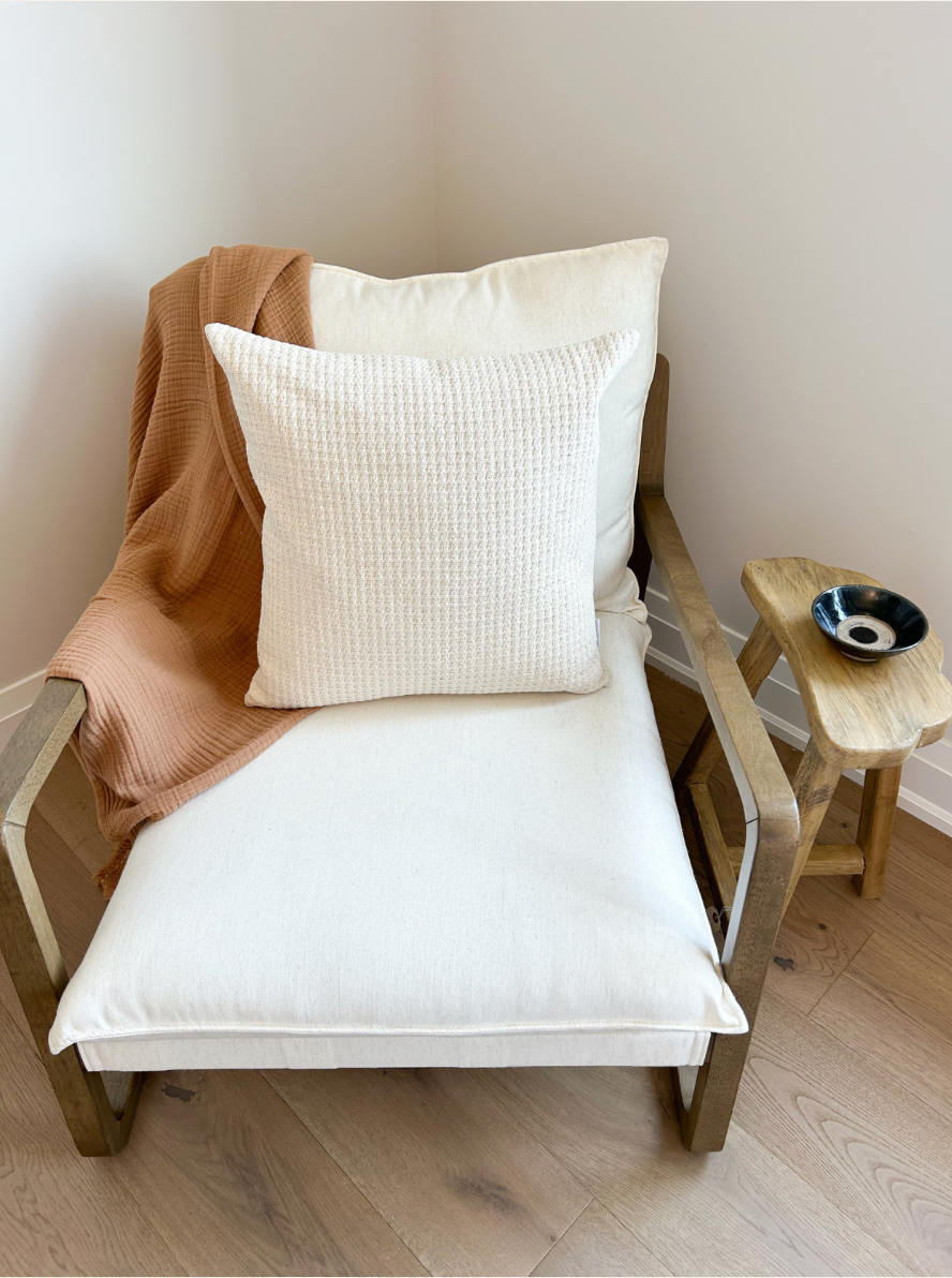 Thai cotton knit featuring a classic bamboo pattern in a warm cream, make this pillow the perfect textural addition for any living space. Style this neutral pillow with prints and patterns for a truly unique feel, or style with other neutrals for a layered, luxurious aesthetic.