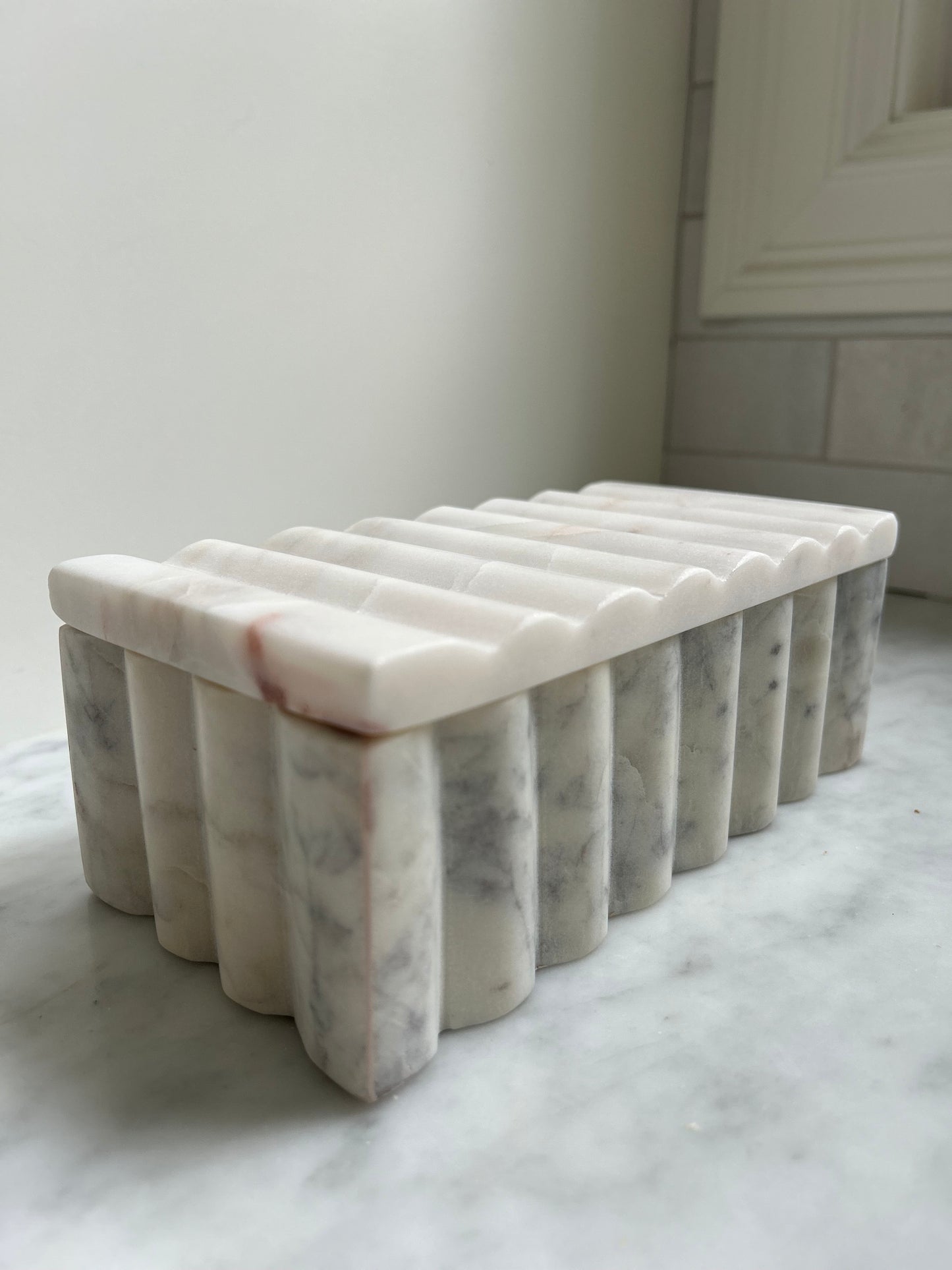 A statement in form and function, the Fluted Marble Box is perfect for storing jewelry, keepsakes, or everyday essentials. Hand-carved from solid marble with elegant fluted detailing, it brings timeless beauty and refined texture to vanities, shelves, or coffee tables.