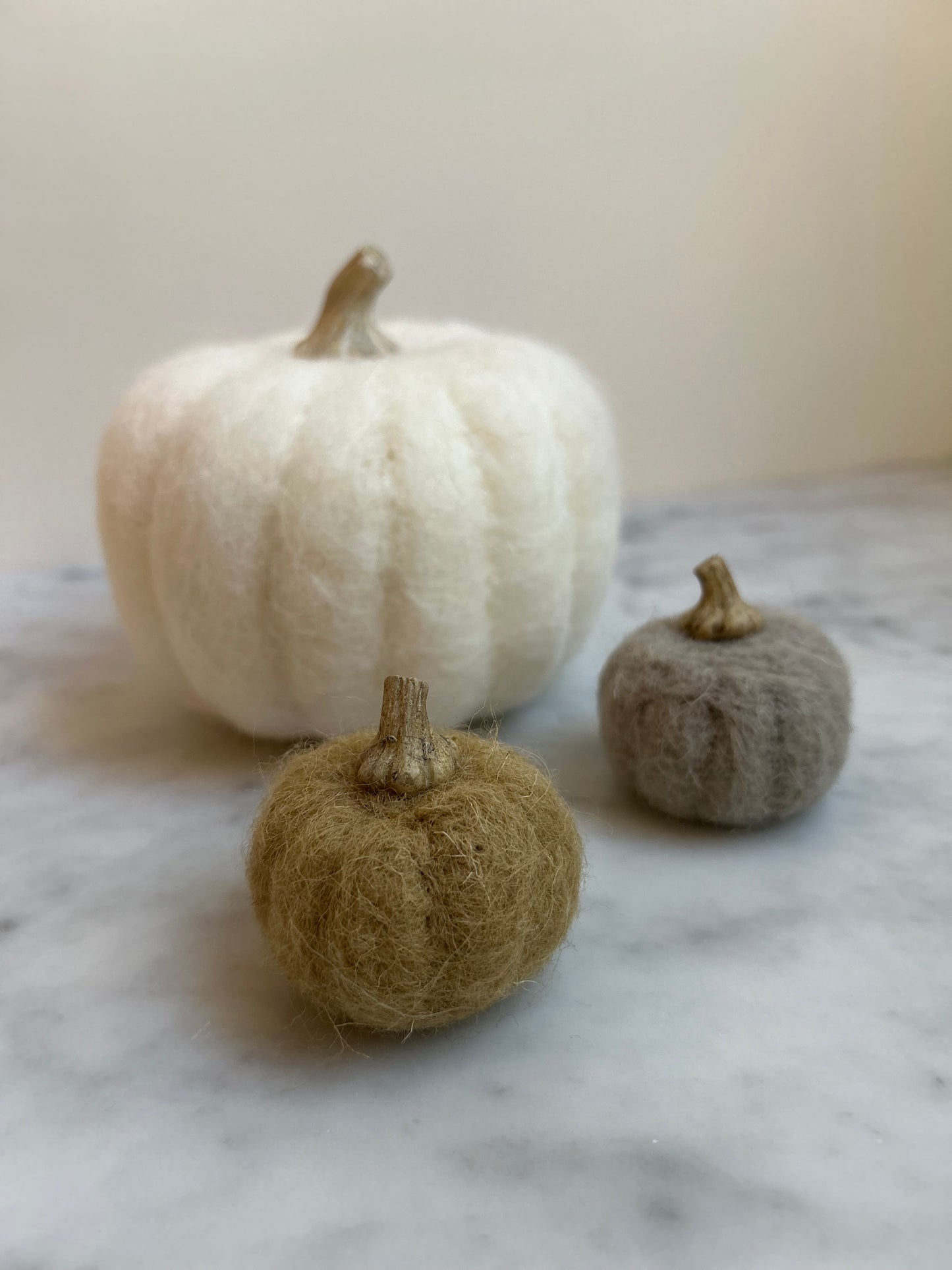 Decorate your harvest table with our adorable, lifelike felt pumpkins. Hand crafted from felted wool and capped with resin stems, they feature neutral earthen colours and look charming when displayed in a bountiful pumpkin patch. Spot Clean.